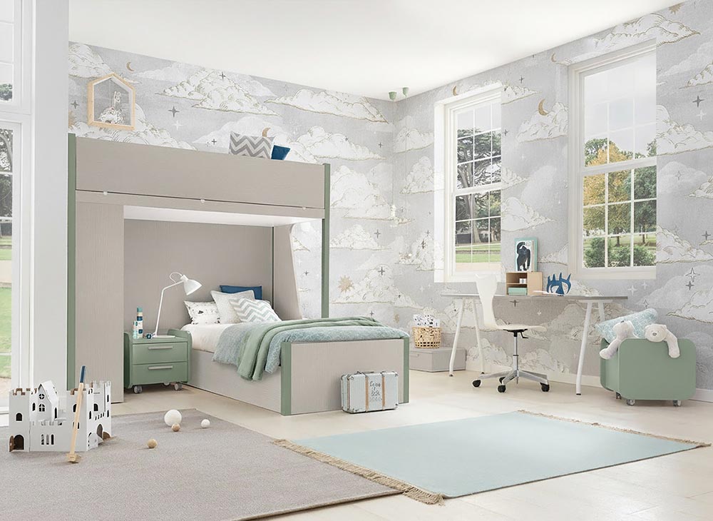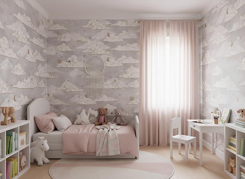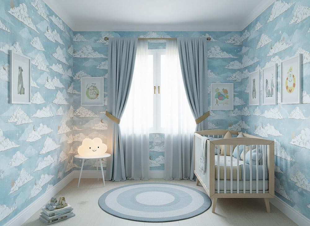 Модерен италиански тапет за детска стая с облаци в пастелни тонове.