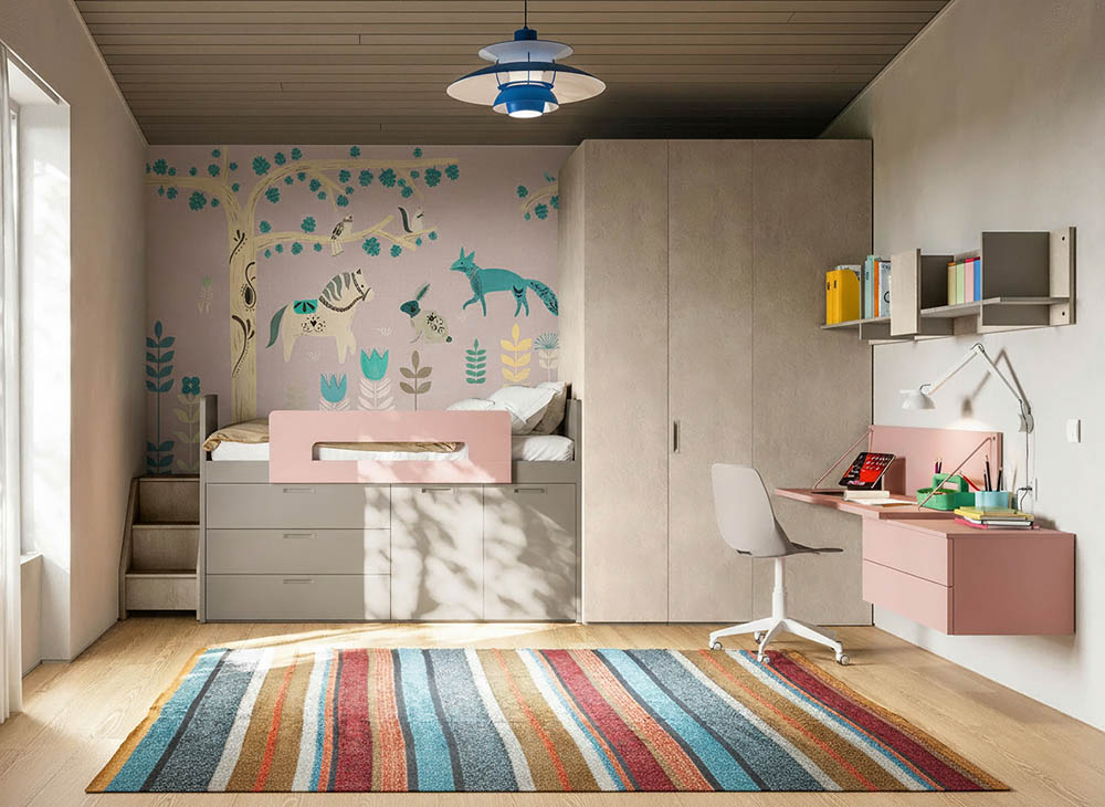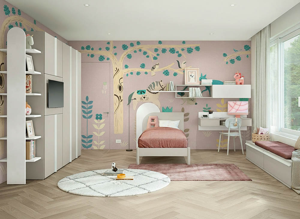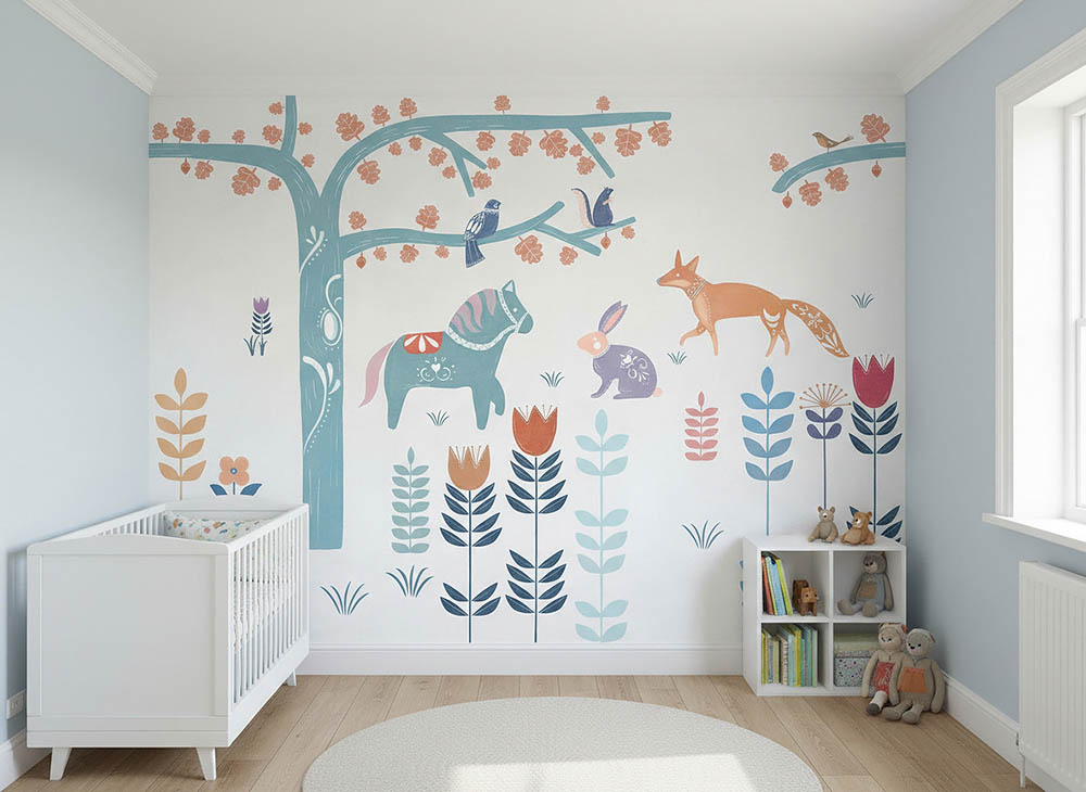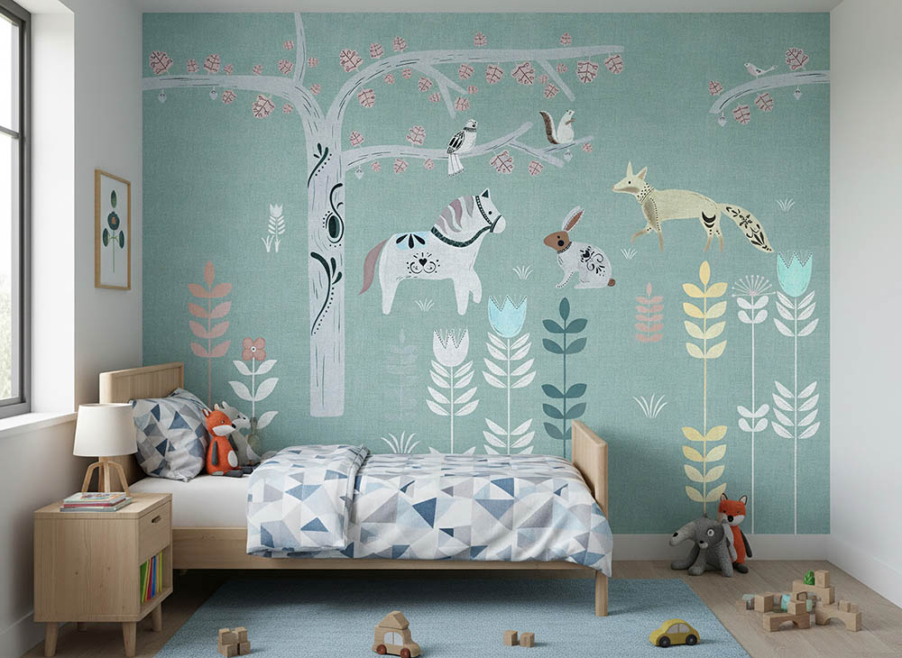 Луксозен италиански тапет за детска стая с горски животни, в мек илюстративен стил и няколко цветови варианта.