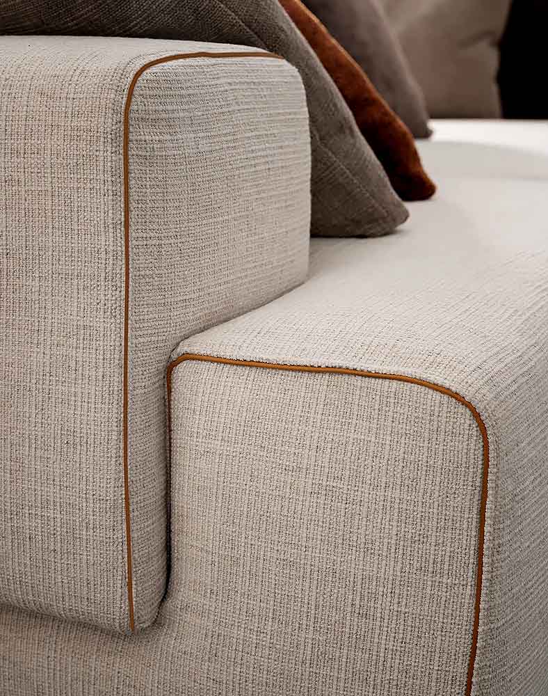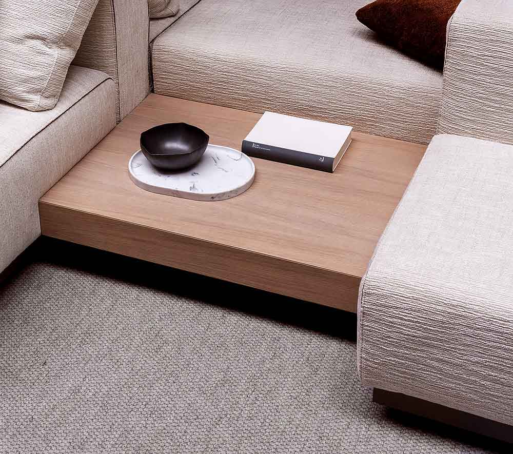 Разнообразие от модулни елементи, позволяващо различни конфигурации – прави, ъглови или с лежанка, като отделните елементи се свързват със специални метални механизми за стабилност и удобство. Възможност за добавяне на допълнителни модули, включително помощна маса, която се интегрира визуално в композицията.