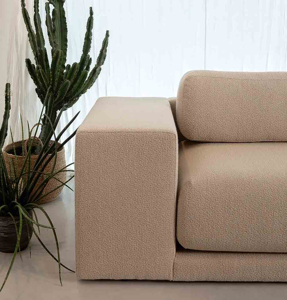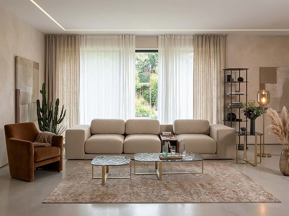 Модулната система позволява различни конфигурации, като диванът може да бъде адаптиран според пространството и индивидуалните нужди.