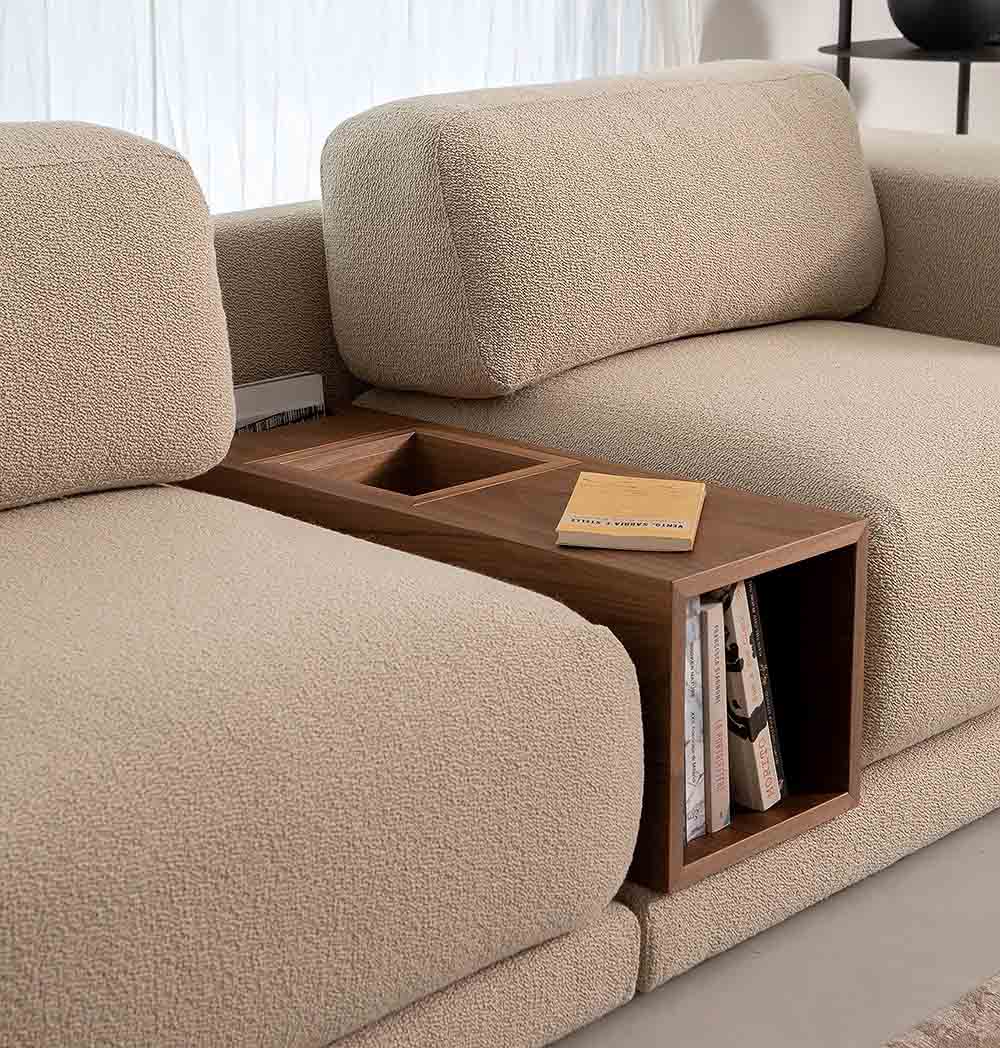 Моделът се отличава с характерни дървени вложки, интегрирани между модулите, които могат да се използват като място за съхранение.