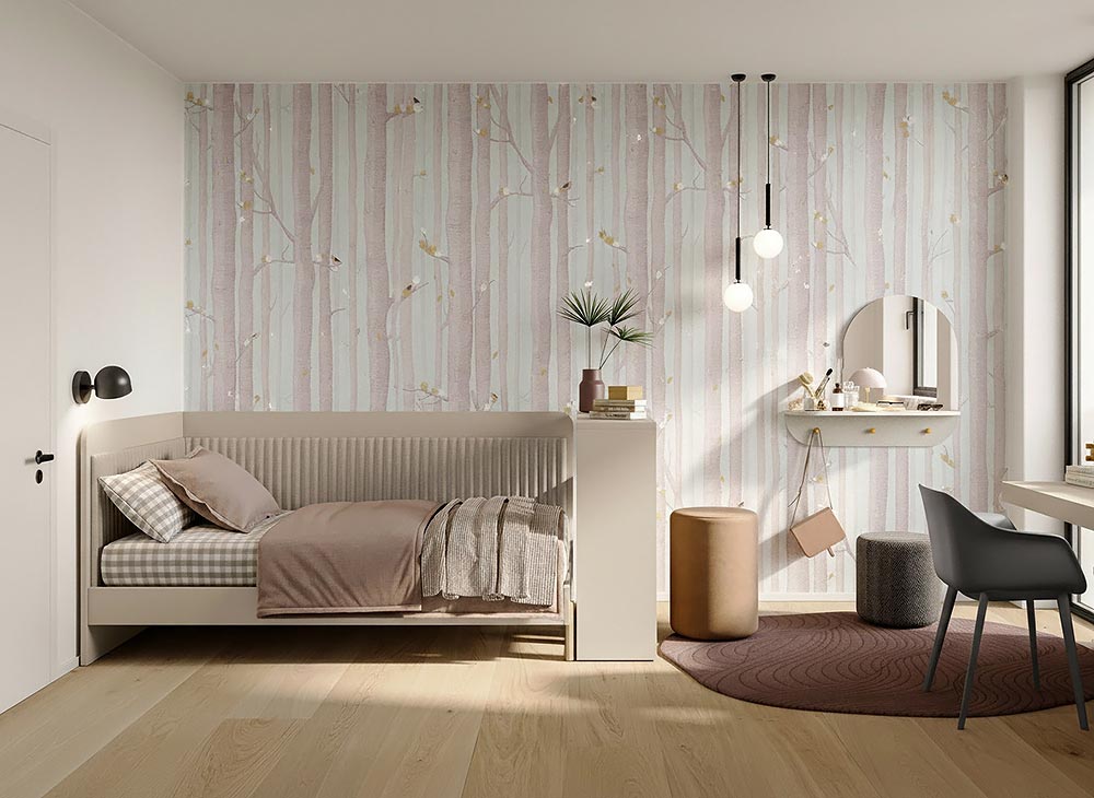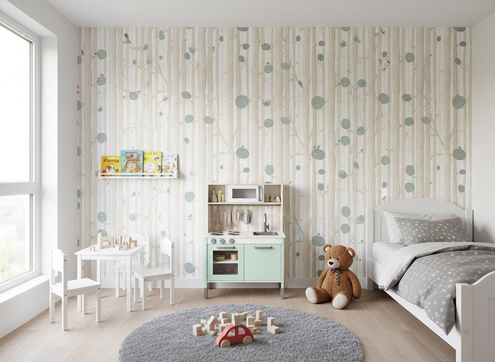 Модерен италиански тапет за детска стая с нежна горска сцена, изпълнена с дървета, птици и природни детайли.