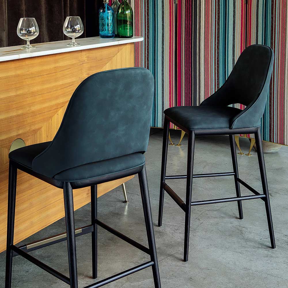 Дизайнерски италиански бар стол с плавно оформени подлакътници, които следват линията на тялото и осигуряват комфорт при седене.