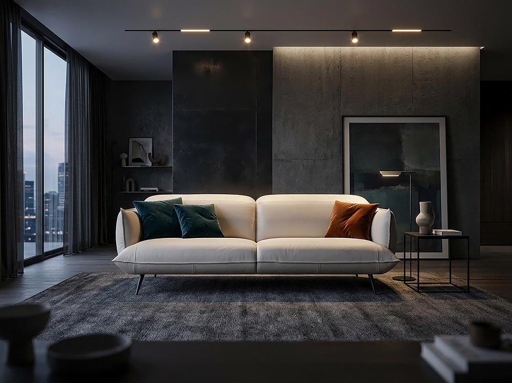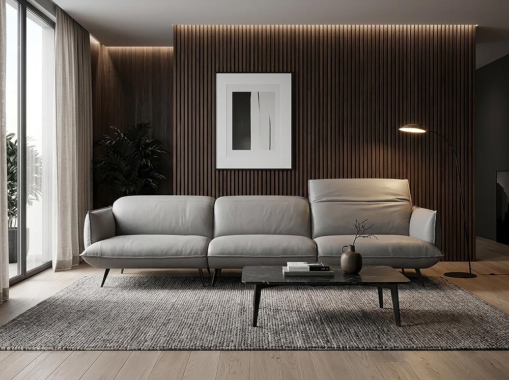 Структура от масив и многослойна дървесина, покрити с полиуретанова пяна. Седалки с пълнеж от екологична полиуретанова пяна, покрита със слой от 100% полиестерни влакна. Метални крака с височина около 17.5 cm, стандартно в матово черно покритие. Повдигнатата конструкция придава визуална лекота на дивана.
