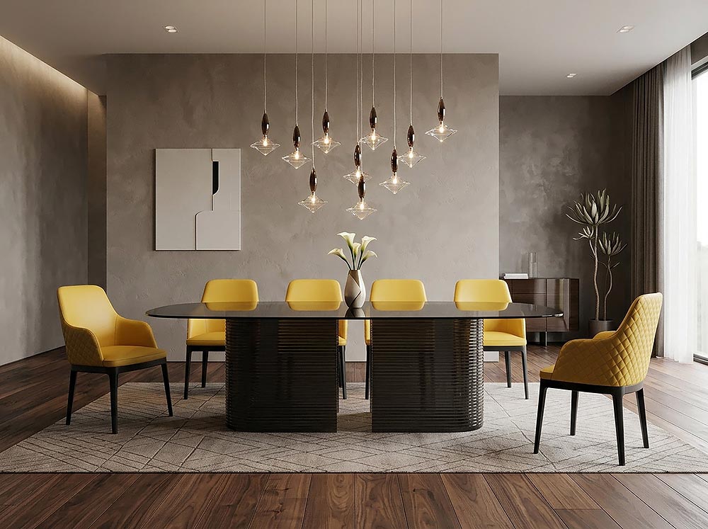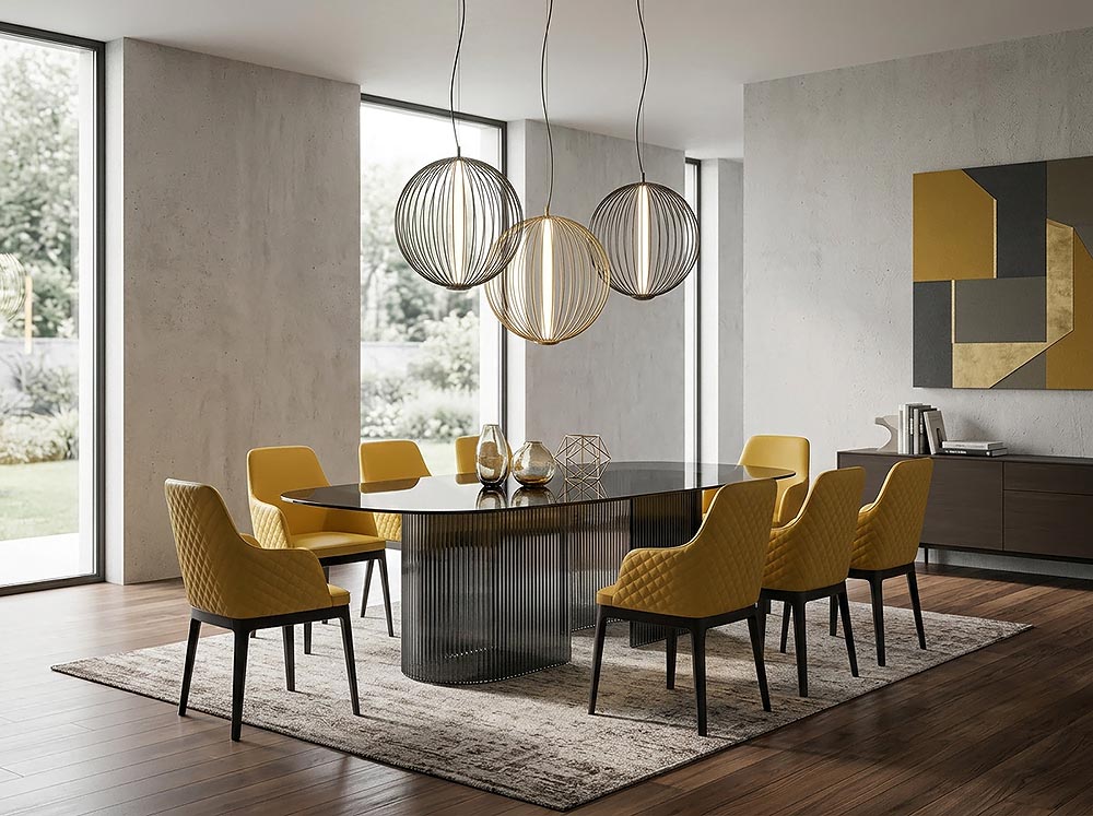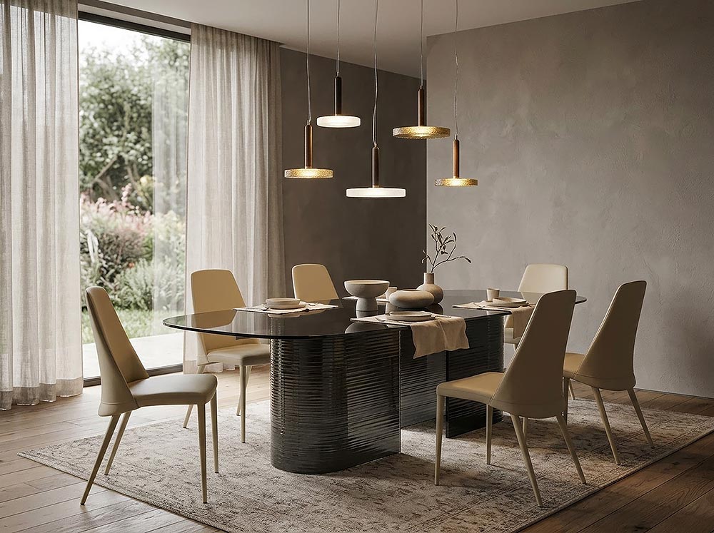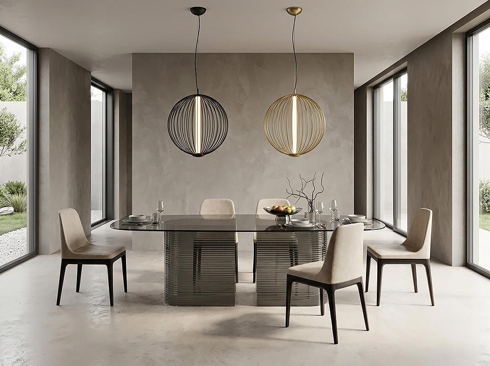 Моделът се предлага в различни нюанси, като фюме или бронзово стъкло, които подчертават отраженията и създават изискано присъствие в интериора.